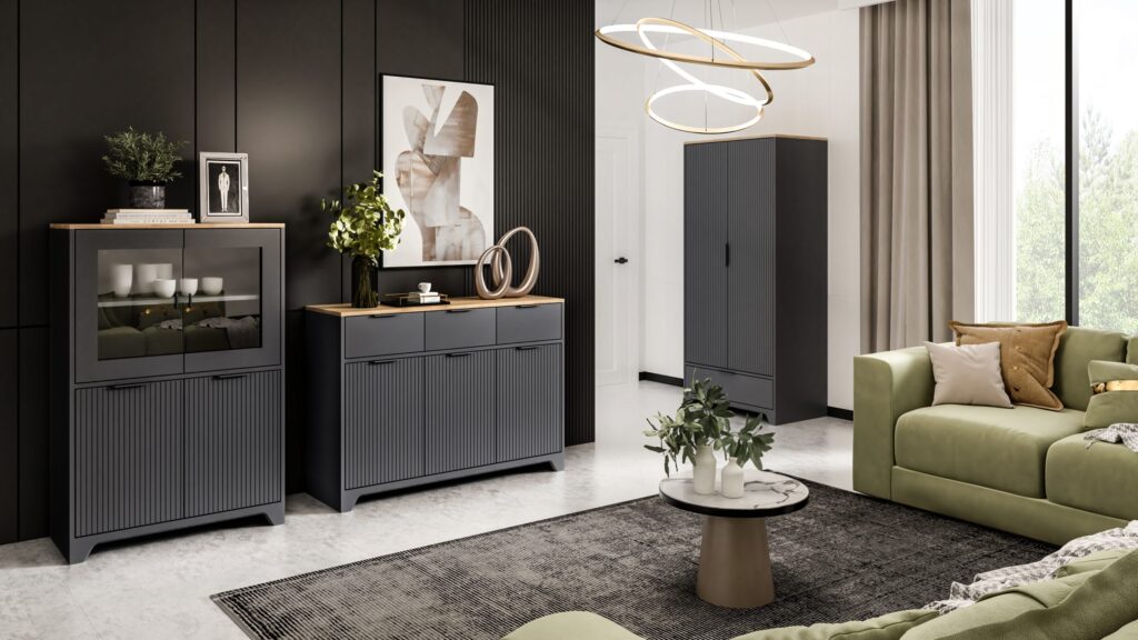 Kolekcja Lara Lamel. Najnowsza kolekcja mebli z płyty od naszego producenta Tłok Meble. Kolekcja dostępna w kolorach które widoczne są na stronie. Blat mebli zawsze w kolorze płyty Craft Złoty. Fronty czyli tzw; lamelki w kolorze antracyt lub mogą być także w kolorze blatu. Fronty tych mebli jak zawsze to płyta meblowa MDF. Przy szufladach zainstalowane zostały metalowe uchwyty z domykiem. Teraz mamy takie meble dostępne w naszym sklepie w Fordonie Dobre meble z …. Możemy urządzać remont swojego mieszkania sugerując się trochę programami pani Doroty Szelągowskiej i jej totalnymi remontami. Przy seryjnej produkcji możemy zakupić takie meble Lara Lamel w przystępnych cenach. Meble jak zawsze przyjeżdżają w całości. Wymiary muszą być zachowane. W witrynach KWD4 zamiast półek z szybą mogą być półki z płyty.