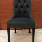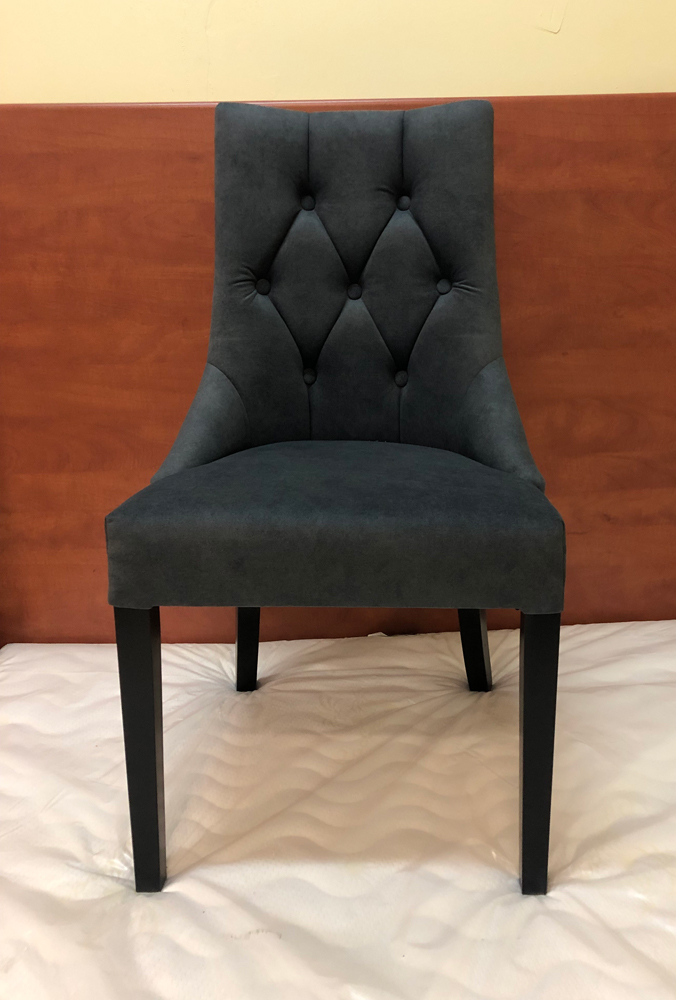 Krzesło Celina. Krzesło tapicerowane …jak Celina od Kazika. Niestety tego utworu nie da się przebić, chyba ,że Dziewczyną bez zęba na przedzie. Przejdźmy lepiej do naszego krzesła tapicerowanego zostawiając dorobek wspaniałego zespołu Kult. Nogi krzesła jak pozostałych modeli wykonane z drewna bukowego malowanego na czarny kolor, w tym konkretnym fasonie. W ofercie duża dowolność wyboru koloru drewna jak i typu tkaniny obiciowej. Tym razem tkanina obiciowa bez widocznych zamazów. W tym modelu zamiast tych guzików mogą być zwykle piki lub kryształki Swarowskiego. Na kolejnym zdjęciu na plecach krzesła tapicerowanego widoczny jest cały pasek gwoździ tapicerskich. Gdyby była taka potrzeba to zawsze można z nich zrezygnować i wtedy fason nabierze innego charakteru. Tylne nogi minimalnie pod ukosem aby fason nagrał większej stabilności. Krzesło jak widać na zdjęciu ciężkie i stabilne. Zobacz pozostałe modele krzeseł tapicerowanych.
