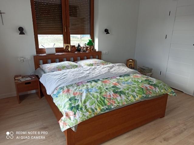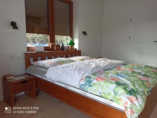 Nasz najnowszy model łóżka. Łóżko Kratka. To bardzo nowoczesny model łóżka. Dostępny jak każdy model naszych łóżek z drewna pod każdy wymiar materaca i każdy system otwierania. Przedstawiony model wykonany jest w drewnie sosnowym pod kolor bejcy 22-45. Oczywiście ten model dostępny jest w wersji bez tych kratek w zagłówku. Obok znajdują się stoliki nocne według wymiaru klienta. Dorobienie do tego komody czy witryna to żaden problem. Potrzebujemy tylko wymiary wymarzonych mebli sosnowych... ten model łózka jest łóżkiem stacjonarnym bez żadnego pojemnika na pościel czy szuflad. Oczywiście możemy zainstalować takie szuflady w dwóch wersjach. Jeżdżące po podłodze na całą głębokość i szerokość łóżka (jeżeli istnieje możliwość aby wtedy je wyciągnąć) albo szuflady jeżdżące na stelażu z drewna jak w komodzie, które w ogóle nie dotykają ani nie rysują podłogi.