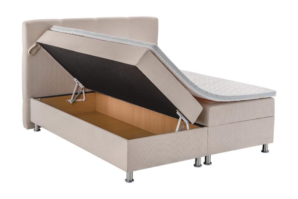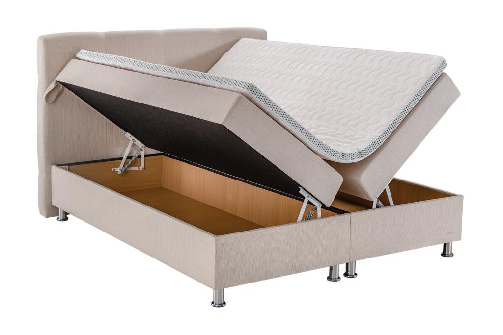Na stelażu z drewna bukowego zainstalowany jest odpowiedni materac ze sprężynami. Każdy fason łóżka dostępny jest w 4 opcjach materacy. Skrzynia z płyty MDF. Nogi do wyboru metalowe lub z drewna pod kolor.