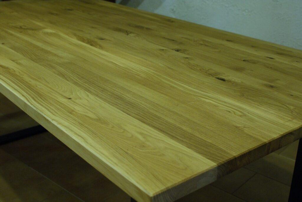 Dąb dziki lakierowany lakierowaniem matowym w połączeniu z prostą formą metalowych nóg nadają meblowi niecodziennego, surowego charakteru.