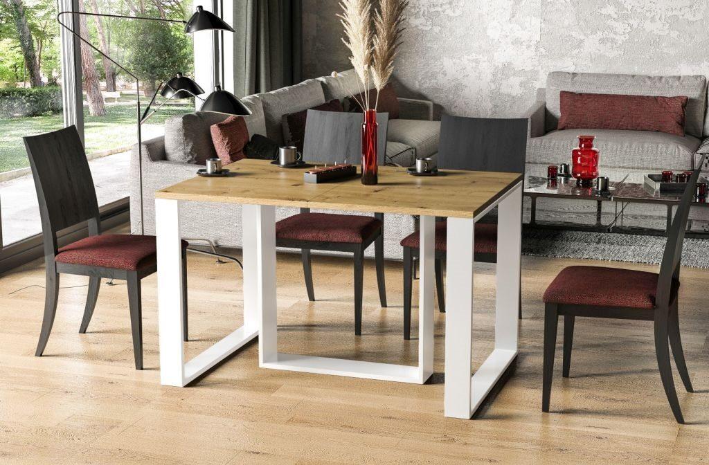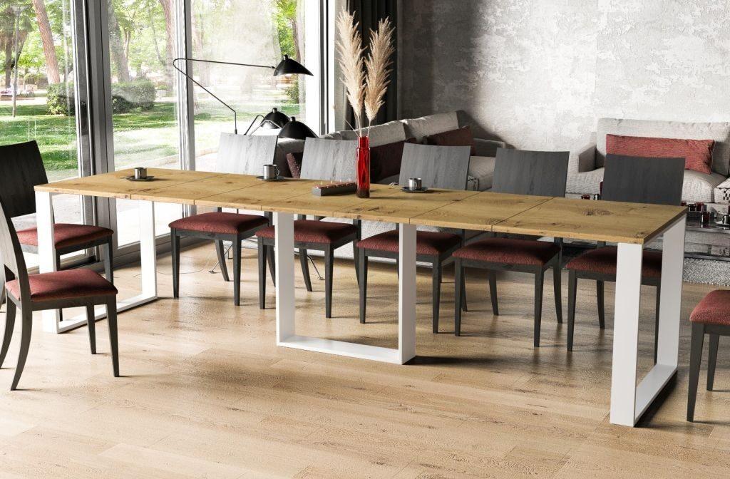 Stół Borys. Innymi słowy ; mały stół z dużymi możliwościami. Proponowany stół Borys to idealne rozwiązanie gdy potrzebują Państwo na co dzień małego stołu aby nie zajmo0wał dużo miejsca. Natomiast gdy przyjdzie ku temu czas, a przyjdzie to mamy porządny stabilny stół. Przy konstrukcji tego stołu jest jedna bardzo ważna rzecz. Pod blat zmieści się prawie każde krzesło , które posiada podłokietniki co jest niemożliwością w wersji tradycyjnych stołów gdzie pod blatem dochodzi jeszcze grubość ościerznicy. Nogi mogą być białe lub czarne. Blat dostępny w 8 kolorach. Wkładki jak widać na zdjęciu nie są chowane pod blatem. Muszą Państwo poszukać dla nich oddzielnego miejsca.