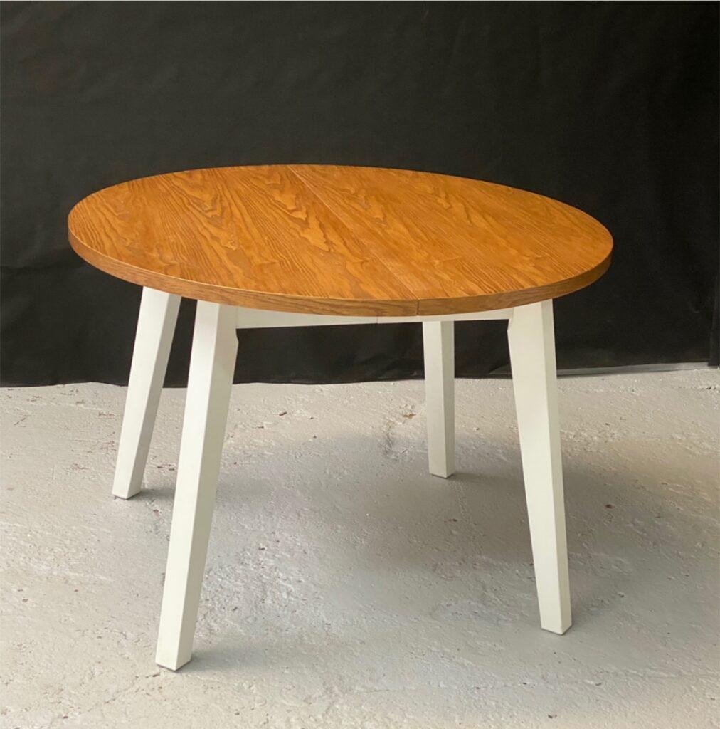 Stół loftowy Olaf. Stół w opcji na nogach drewnianych , bukowych malowanych w dowolnym kolorze. Na zdjęciu na biało-biało ale może być naturalny buk. Nogi bukowe możemy pomalować na dowolny kolor także pod próbkę klienta. Na obecną chwilę kolorystka jest w miarę jednolita ; czyli blat okleina naturalna dębowa z sękami a nogi zazwyczaj czarne lub białe. Zdarzają się oczywiście zamówienia gdy wszystko jest w tym samym kolorze. Tutaj zawsze musimy spojrzeć na kolorystkę pozostałych mebli i otoczenia w którym będzie stał Państwa stół Olaf. Gdyby była potrzeba innego wymiaru blatu albo zrobienie stołu nierozkładanego to damy radę. Zobacz pozostałe modele naszych stołów loftowych.