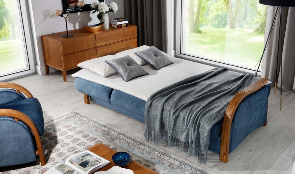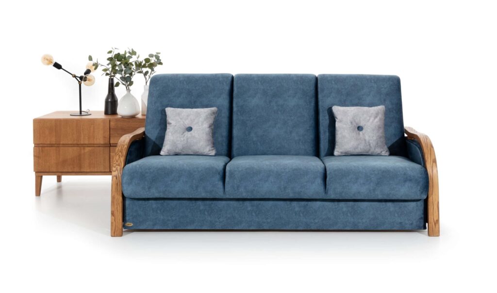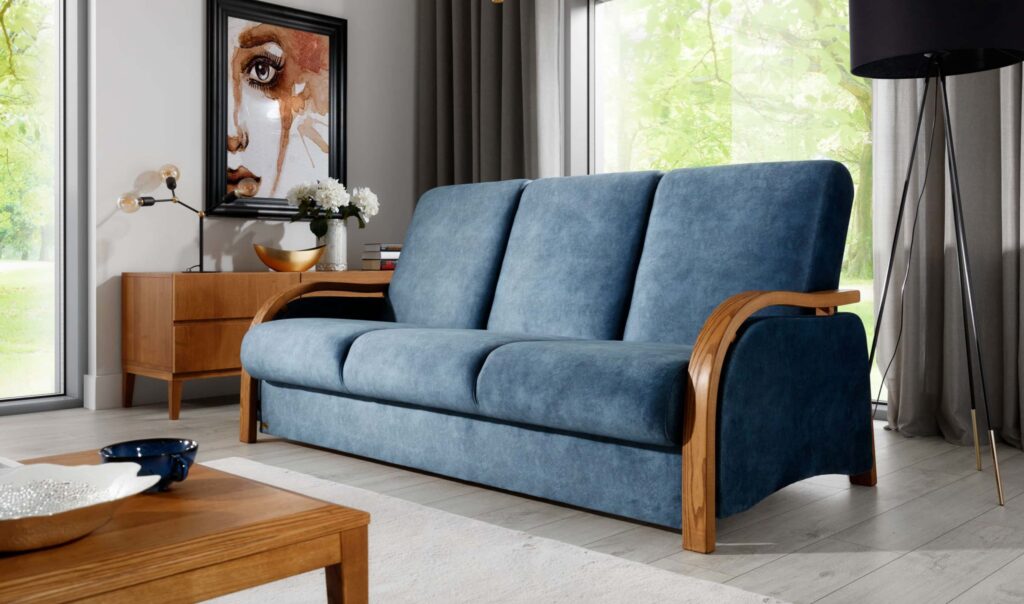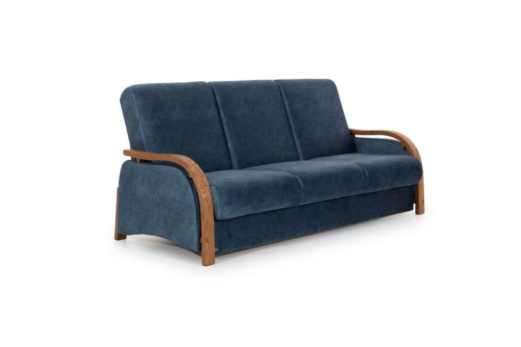 Wersalka Clasic VIII . Jedna z trzech wersalek , która posiada duży pojemnik na pościel . Model ten ma dużą powierzchnię spania jak na typową wersalkę. Dzięki temu siedząc w niej możemy swobodnie oprzeć głowę . Siedzisko jest dosyć głębokie co może nie jest wygodne dla każdej osoby, ale zawsze jest coś za coś. Poprzez poprzeczne przeszycia występujące na wersalce powstaje nam sześć pól. Podwójne sprężyny zainstalowane w jej wnętrzu powodują to ,że siadając na tych przeszyciach nie czujemy żadnego dyskomfortu. Mebel jak zawsze dopracowany wizualnie a szerokie elementy boczne z drewna bukowego malowanego pod kolor klienta powodują to ,że jest to fason z przeznaczeniem do większych powierzchni. Jednak zawsze jest wyjście z sytuacji , trzeba tylko wersalkę Clasic zamówić w jaśniejszej tkaninie obiciowej a jeszcze lepiej w tkaninach z systemem aqua clean dostępnych w naszej ofercie. Zobacz pozostałe fasony niezawodnych wersalek.