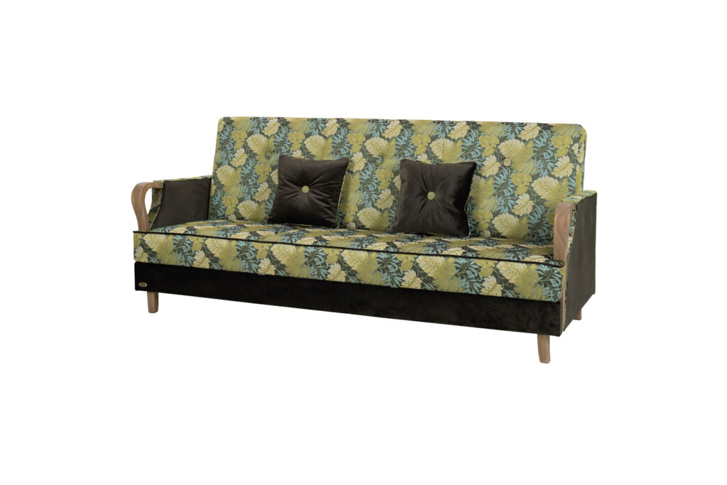 Wersalka Milano. Model wersalki, która została wyprodukowana w 2023 roku. Fotel do tego fasonu w sprzedaży już funkcjonuje od kilku ładnych lat. Boki wersalki to drewno jesionowe co widać po specyficznym usłojeniu. Wersalka posiada pojemnik na pościel. Cały kręgosłup mebla jak w przypadku każdego mebla z Unimebel jest na bazie drewna bukowego i sklejki. Dzięki temu te meble wytrzymują u naszych klientów po kilkanaście ładnych lat. Na zdjęciu znajduje się tkanina katalogowa o numerze 530 ( wzór). Do niej są w ofercie dwie tkaniny jednolite o numerach 528 i 529. Natomiast samych tkanin jest do wyboru około tysiąca sztuk. Tutaj dopiero można poszaleć. Bardzo prosty fason wersalki . Na nóżkach. W tym modelu występuje sprężyna falista i pianka typu HR czyli mamy miękkie siedzisko a co za tym idzie w parze także spanie. Możemy ten fason obić dowolną tkaniną z naszej palety tkanin obiciowych. Jak widać na zdjęciu może to być tkanina wzorzysta z jednolitą ale tak samo mogą to być dwie jednolite tkaniny lub tylko jeden rodzaj i gatunek. W tym względzie decyzja należy już do klienta. Możemy Państwu zaproponować tkaniny włoskie z katalogu Cavallo ( zobacz cały katalog ) . Zobacz pozostałe modele niezawodnych wersalek z naszej oferty.